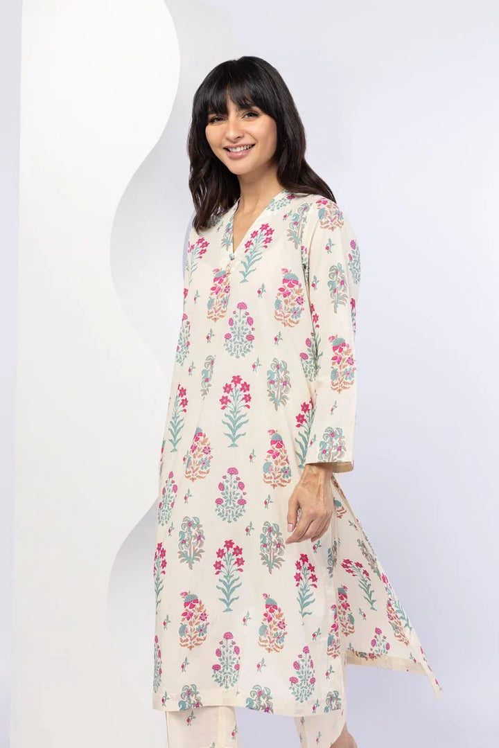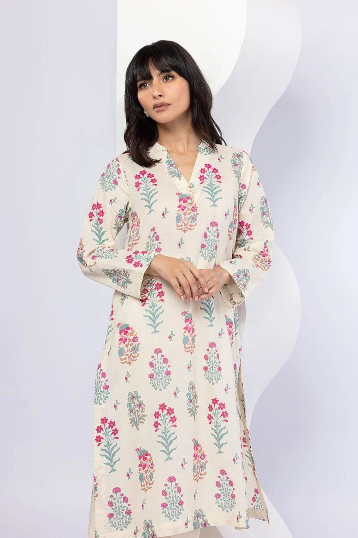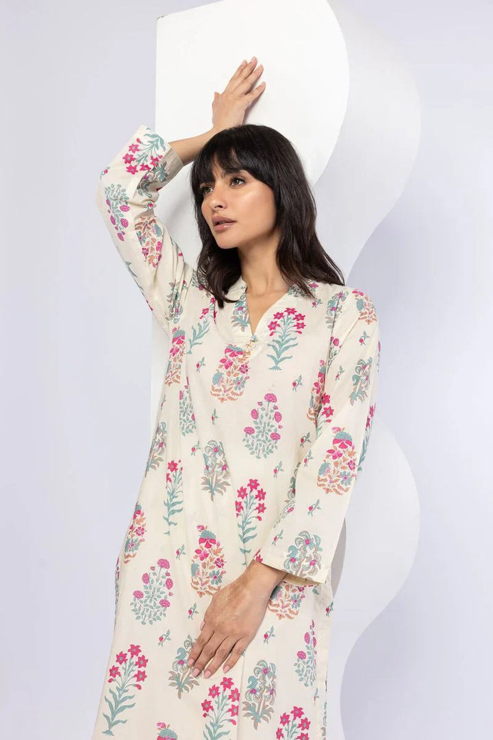 A long floral printed kurta featuring full sleeves, a band collar with a V-cut and button detailing on the front