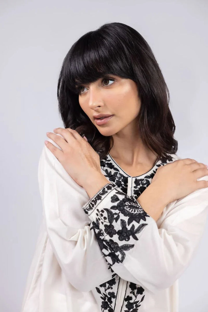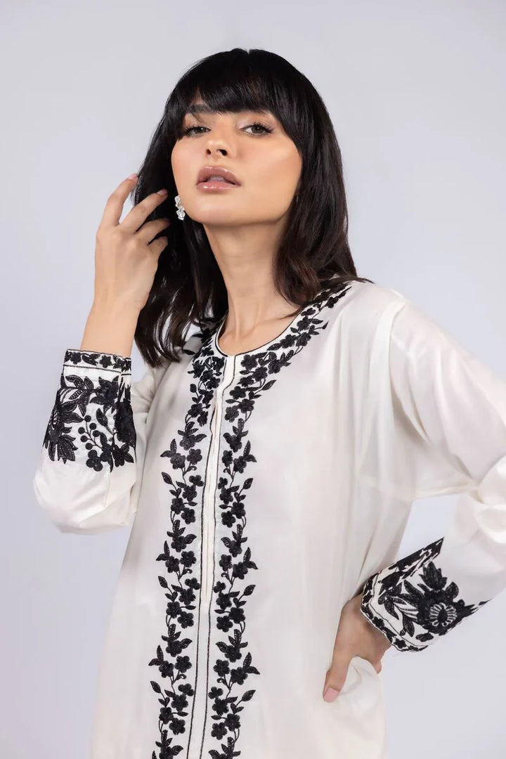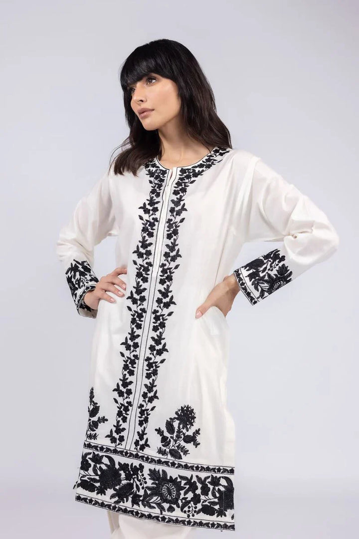 A floral embroidered kurta featuring full sleeves and a round neckline with a V-cut design