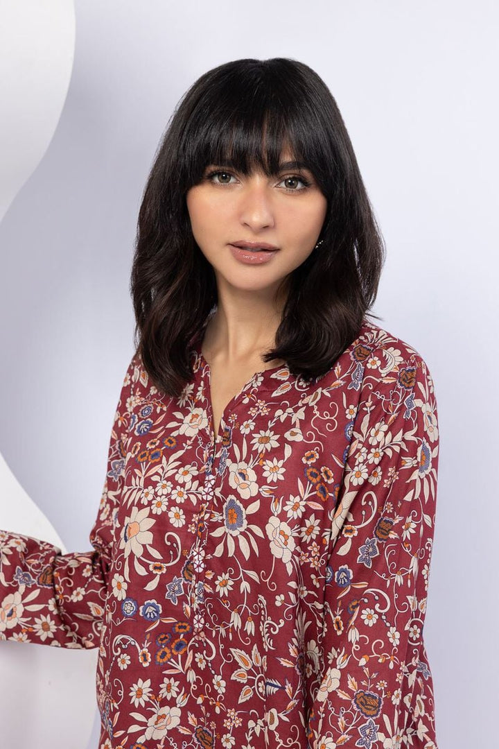 A short floral printed kurta with full sleeves, a round neckline with a V-cut and button detailing on the front