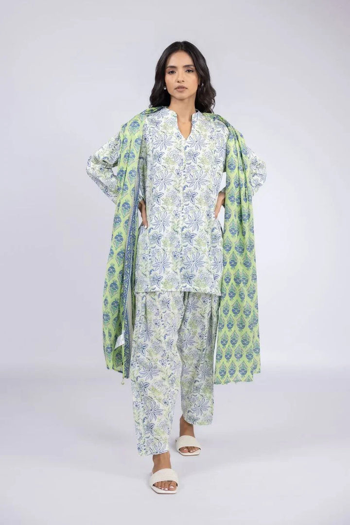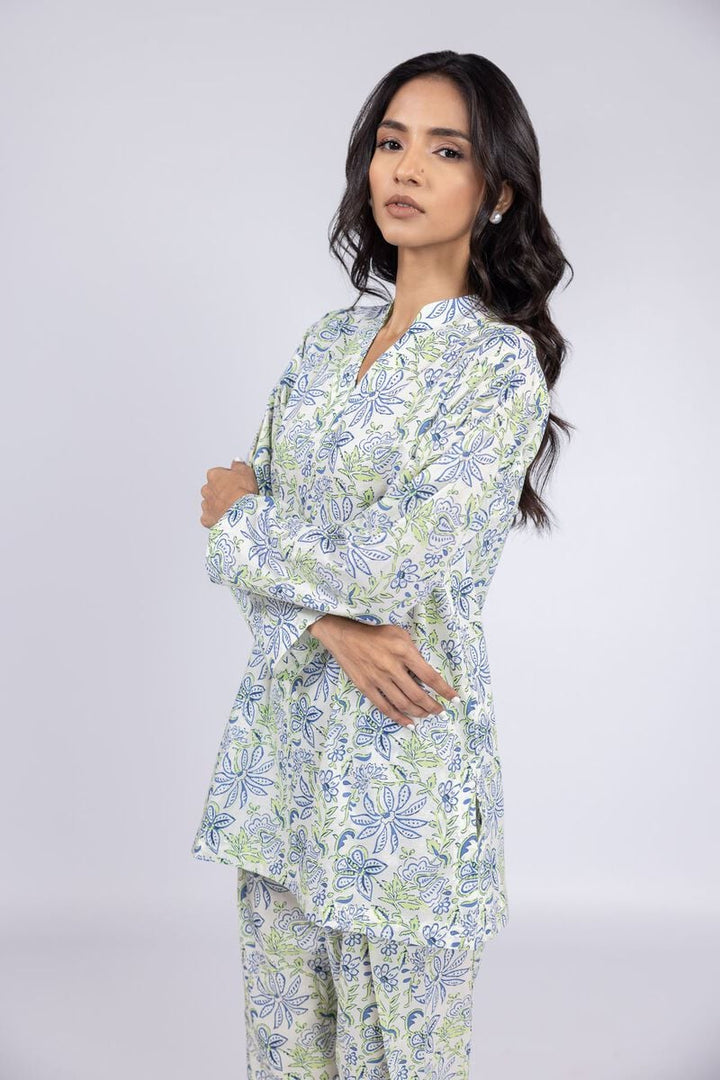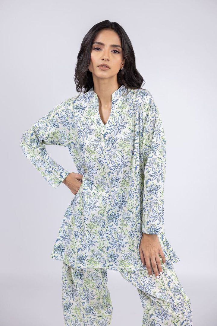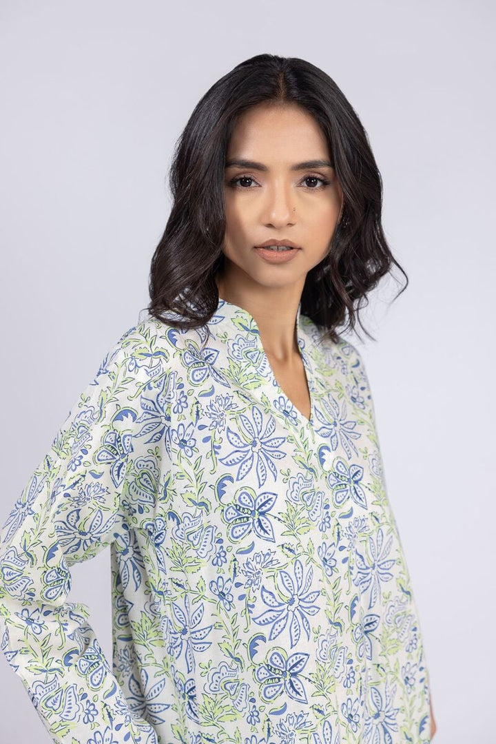 A short floral printed kurta featuring full sleeves and a diamond neckline