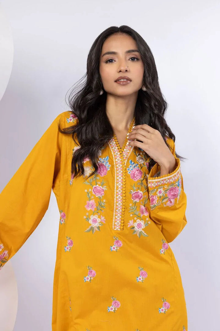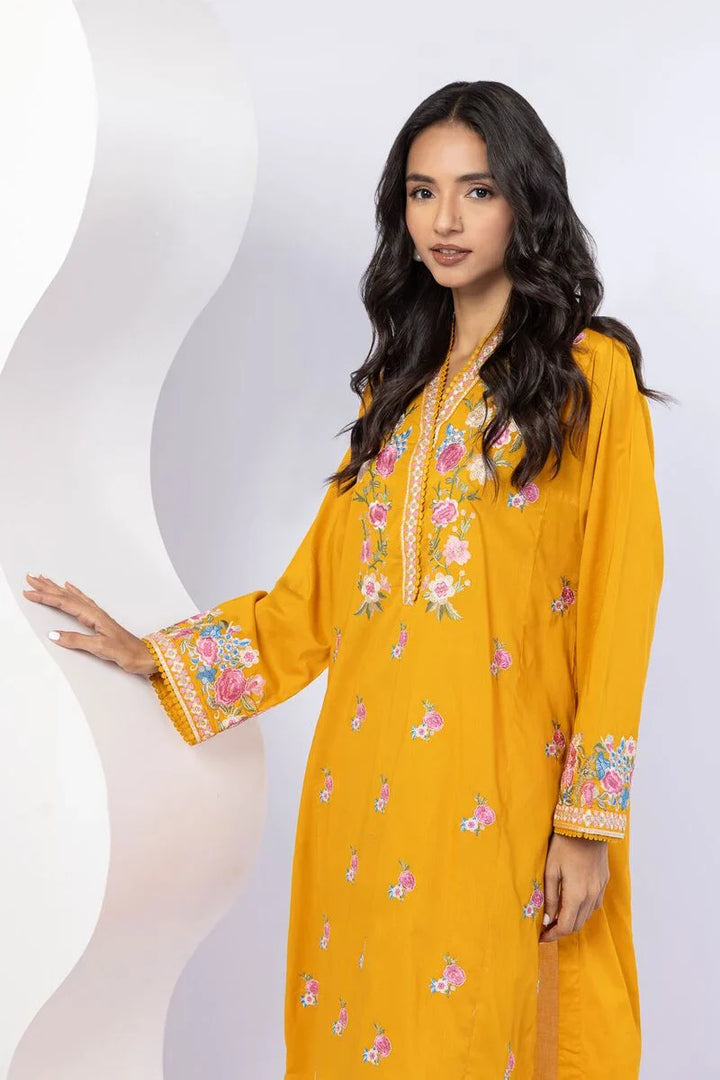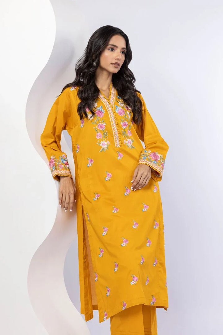 A long floral embroidered kurta featuring full sleeves with lace detailing, and a neckline with a V-cut