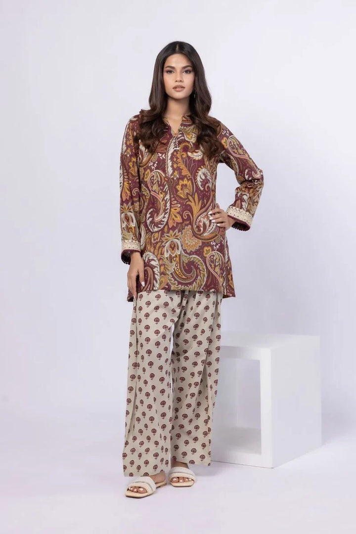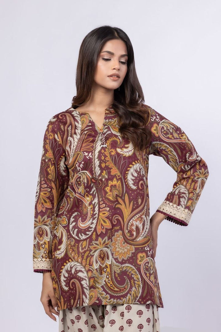 Short printed kurta with embroidered full sleeves and a band collar accented by a V-slit and tassel detailing.
