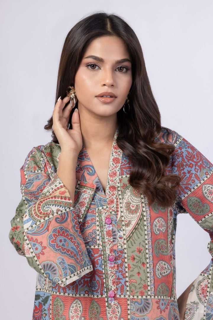 A long floral printed kurta featuring full sleeves and a V-cut neckline with button detailing on the front.