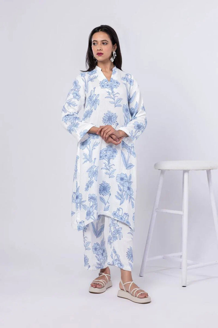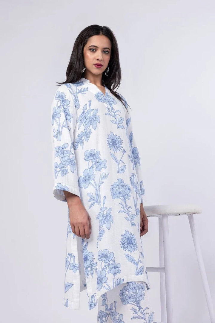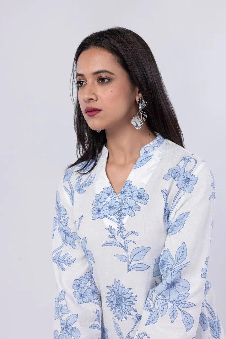 A long floral printed kurta featuring full sleeves and a band collar with a V-cut.