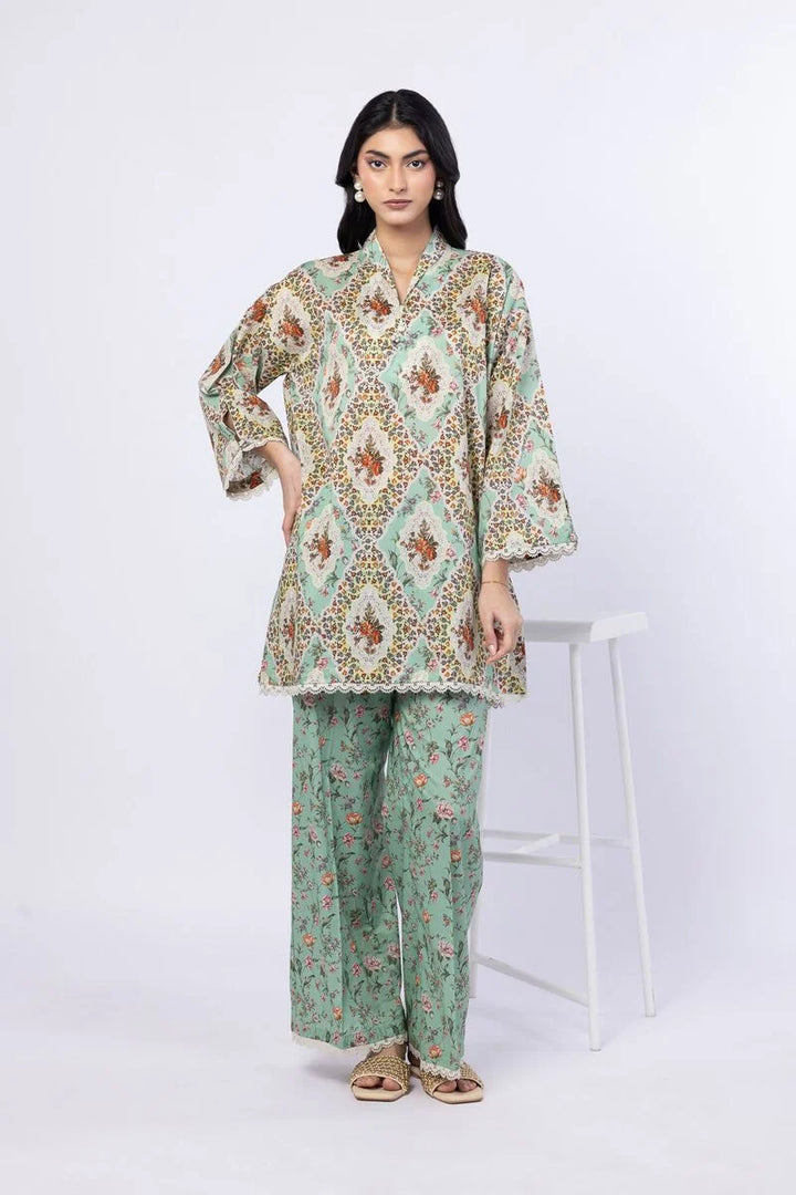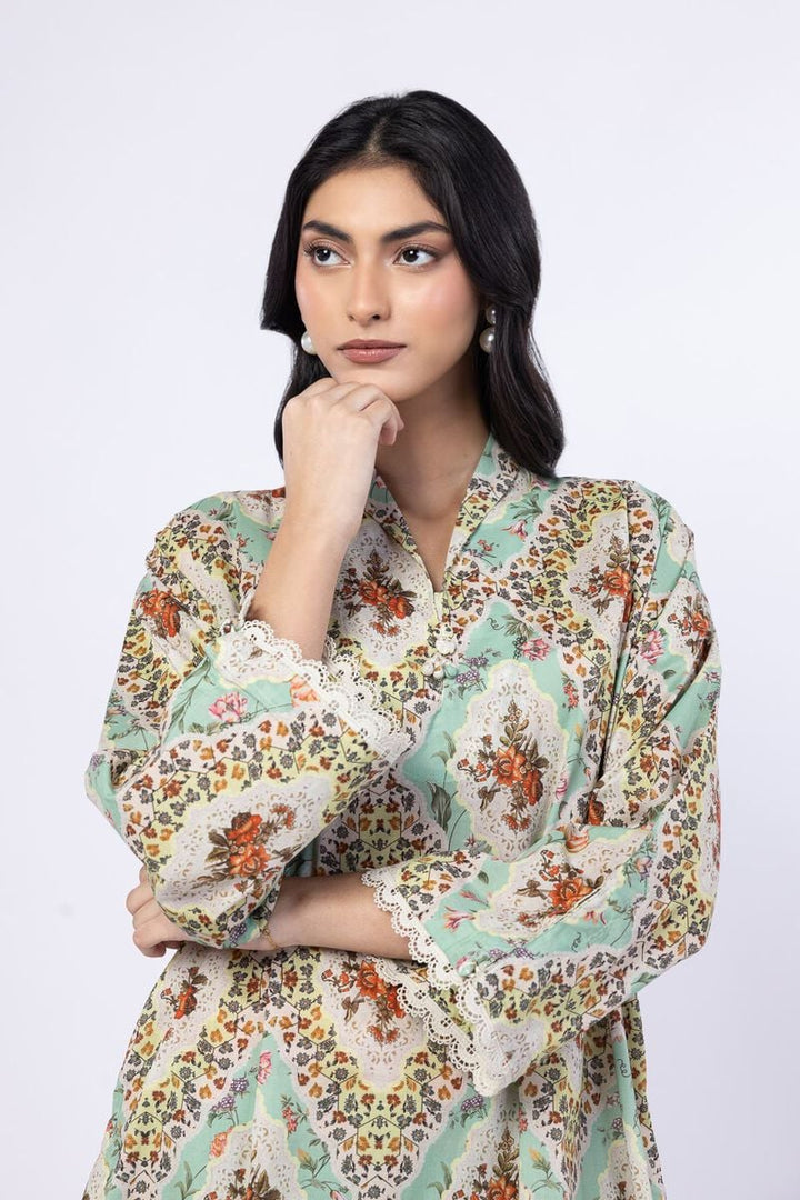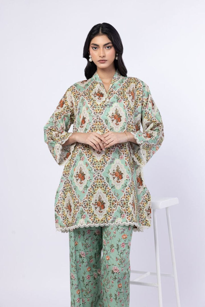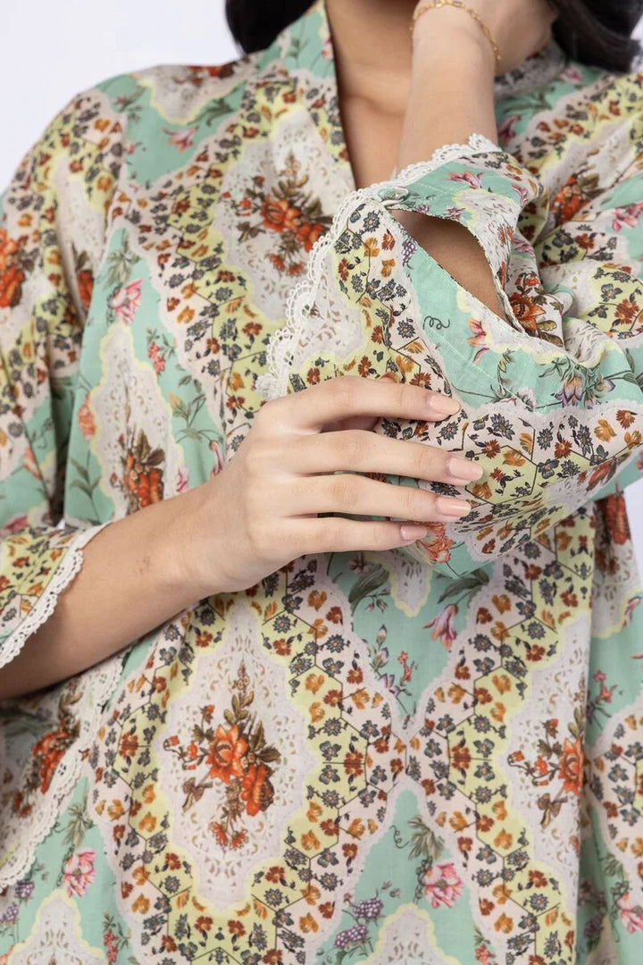 A short floral printed kurta featuring full sleeves with lace inserts and a V-neckline.