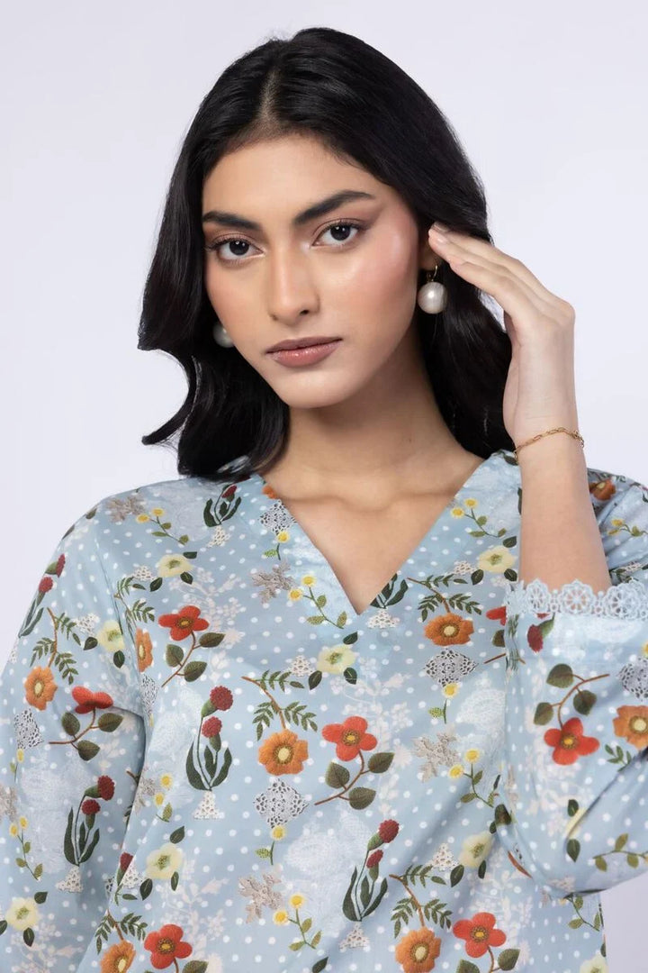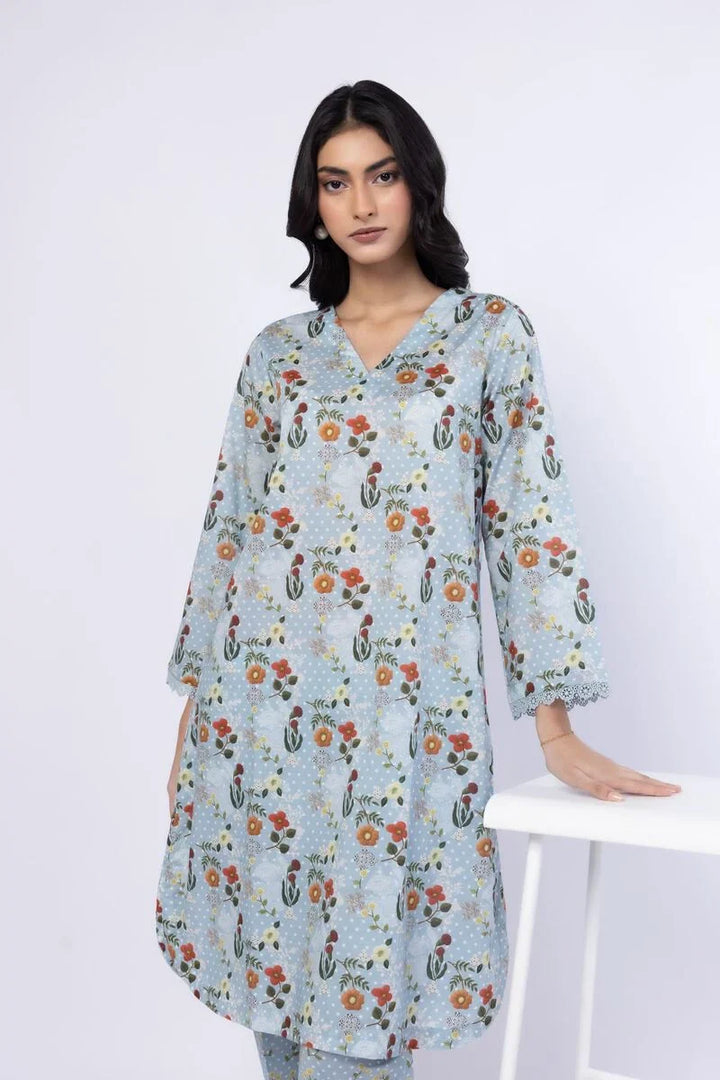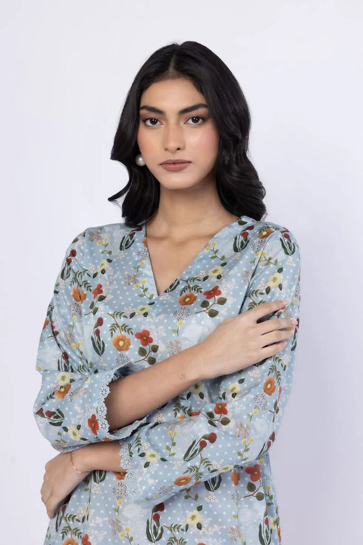 A long floral printed kurta with a rounded hem featuring full sleeves with lace inserts and a neckline with a V-cut.