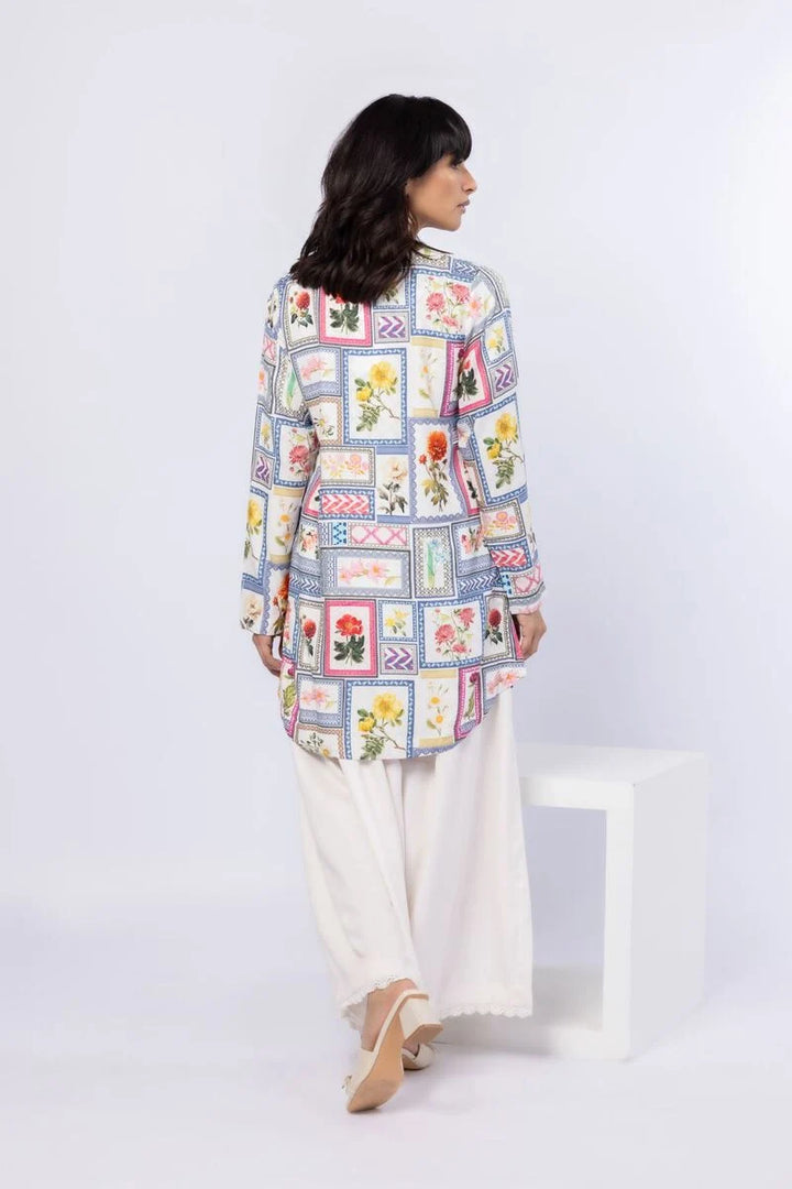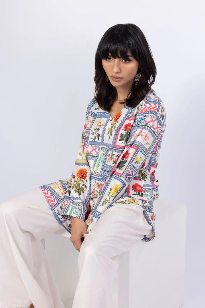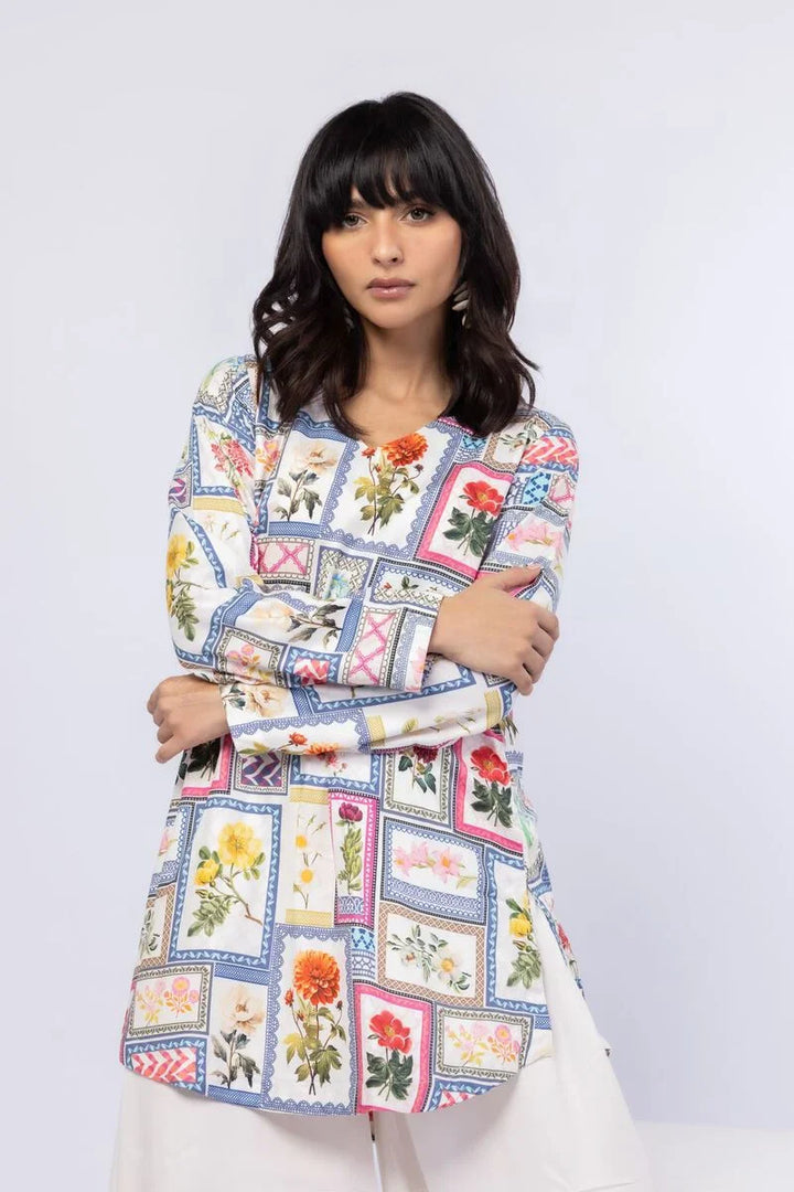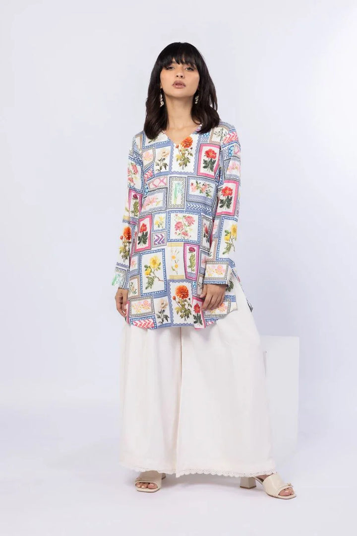 A short floral printed kurta featuring full sleeves and a neckline with a V-cut.