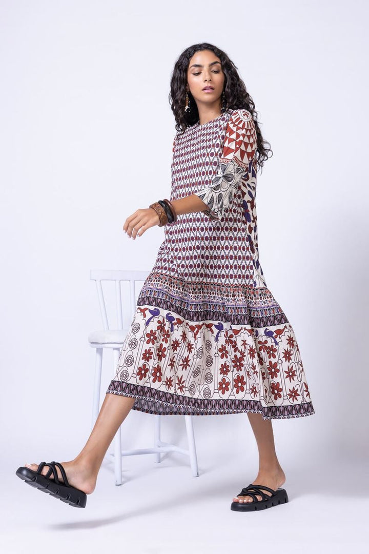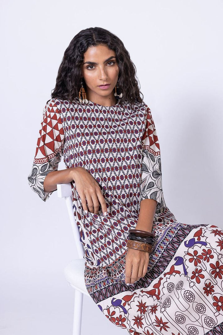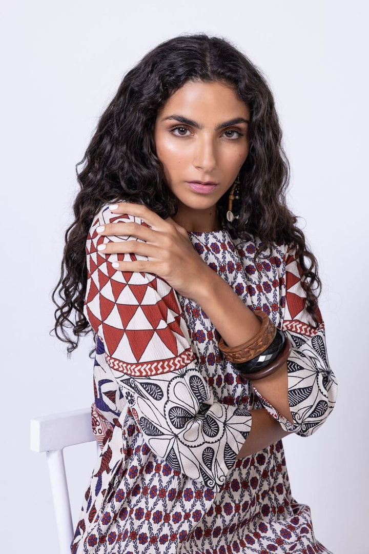 - Description: A long printed ripple crinkle maxi dress featuring short sleeves and lace inserts at the hem.