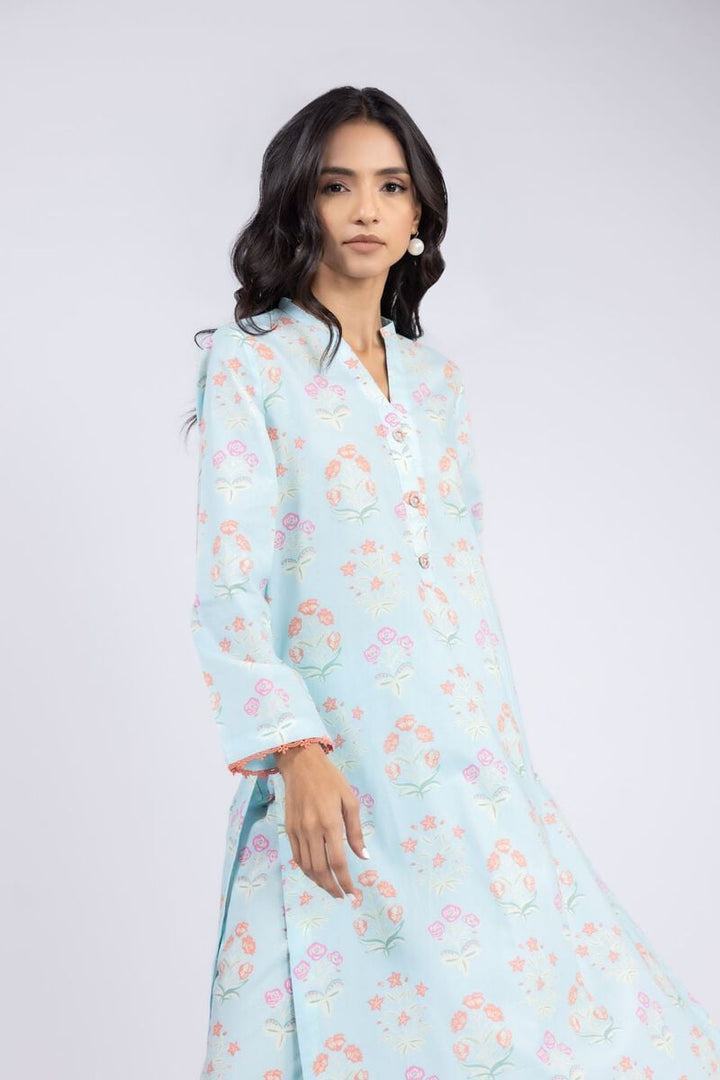 - Description: A long floral printed kurta featuring full sleeves with lace detailing, a band collar with a V-cut and button detailing with pearls.