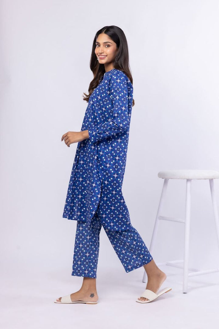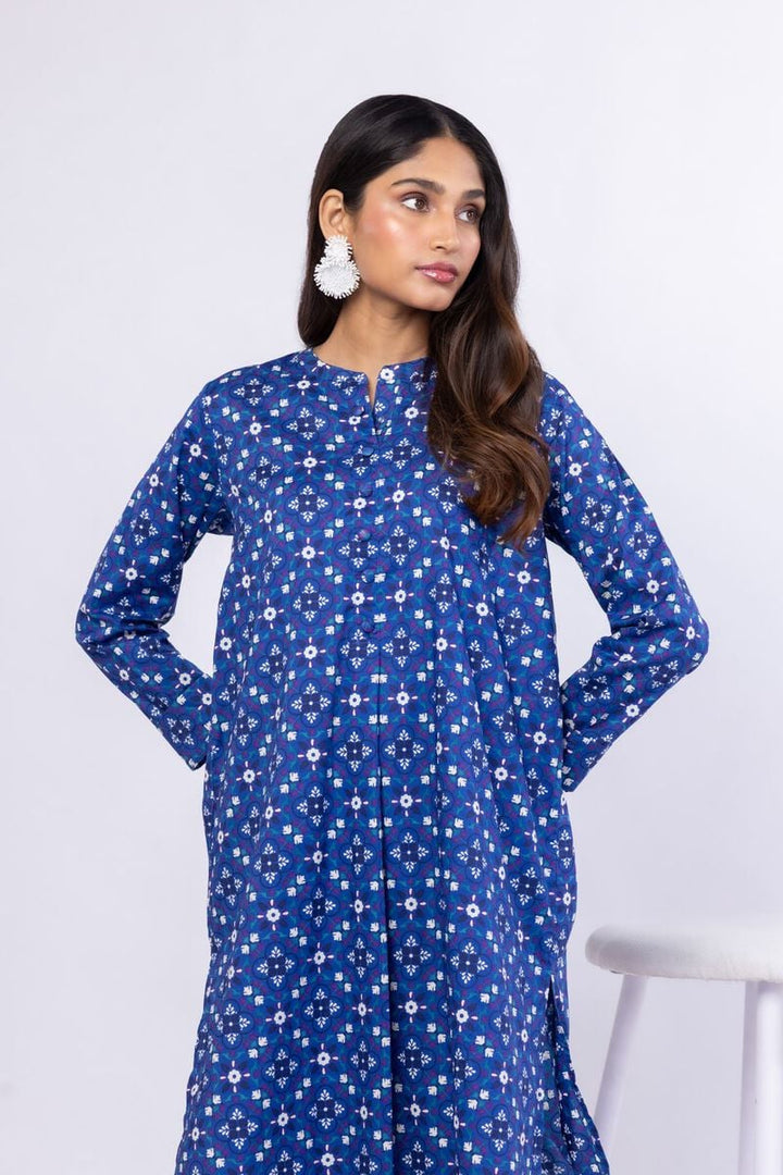 A long floral printed kurta featuring full sleeves and a round neckline with buttons.