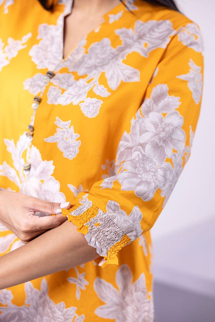 A short floral printed kurta featuring three-quarter sleeves and a band collar with a V-cut.