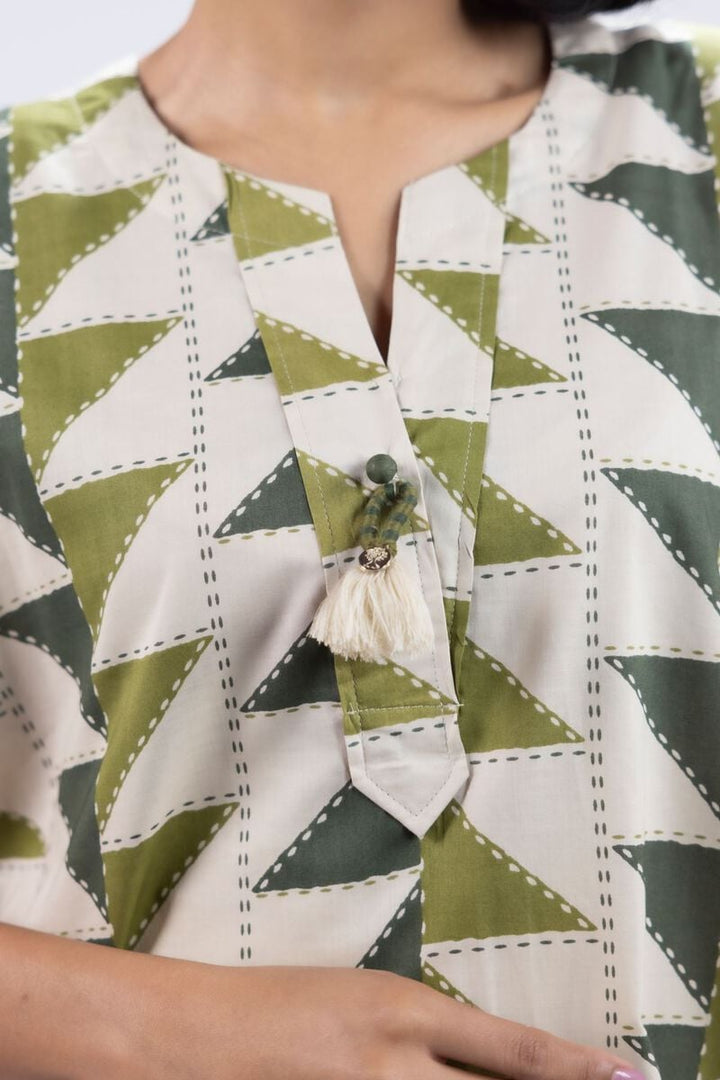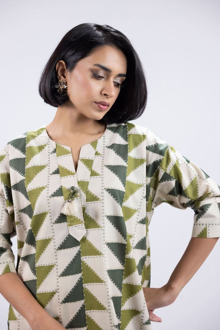 - Description: A short kurta with a rounded hem, featuring a geometric print, short sleeves and a round neckline with a V-cut.