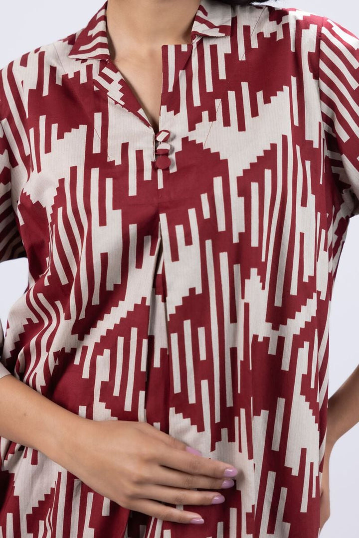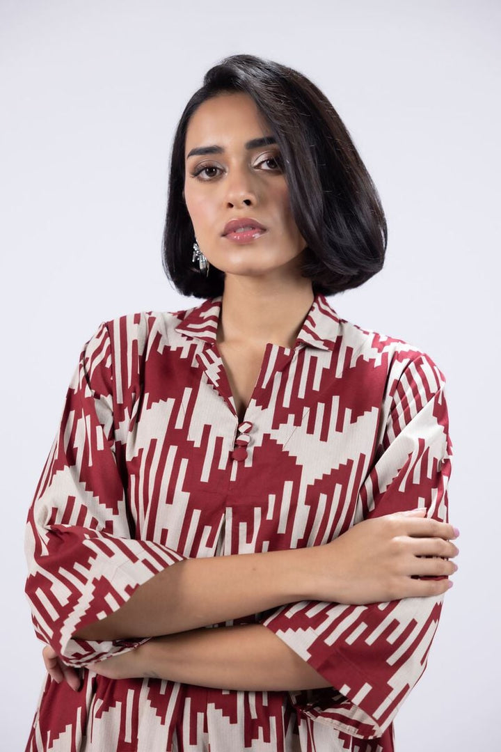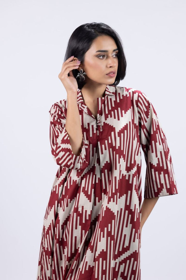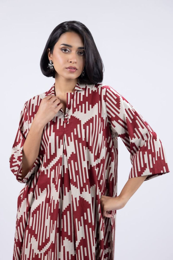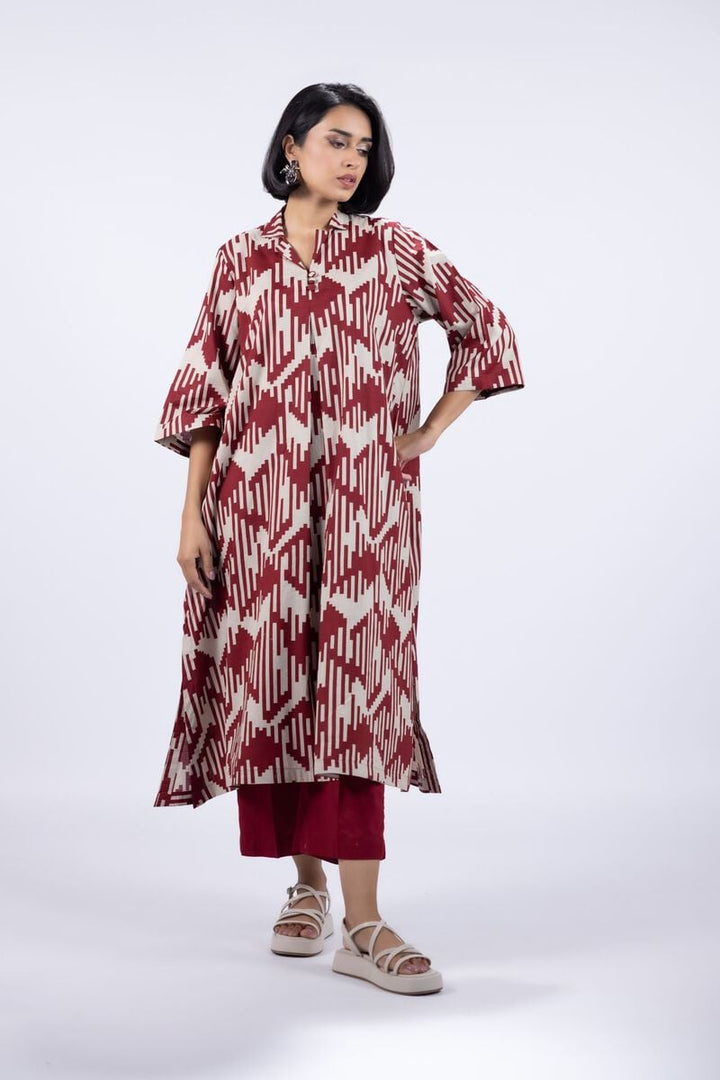 - Description: A long printed kurta featuring three-quarter sleeves and a wing collar.