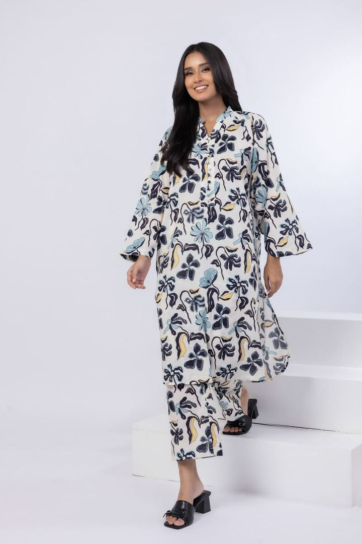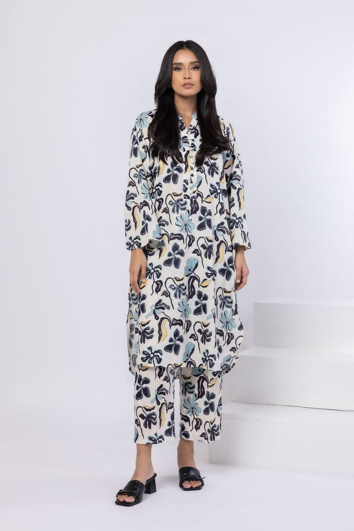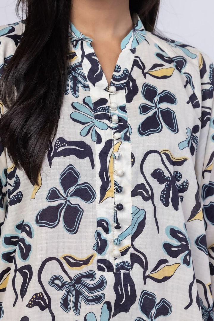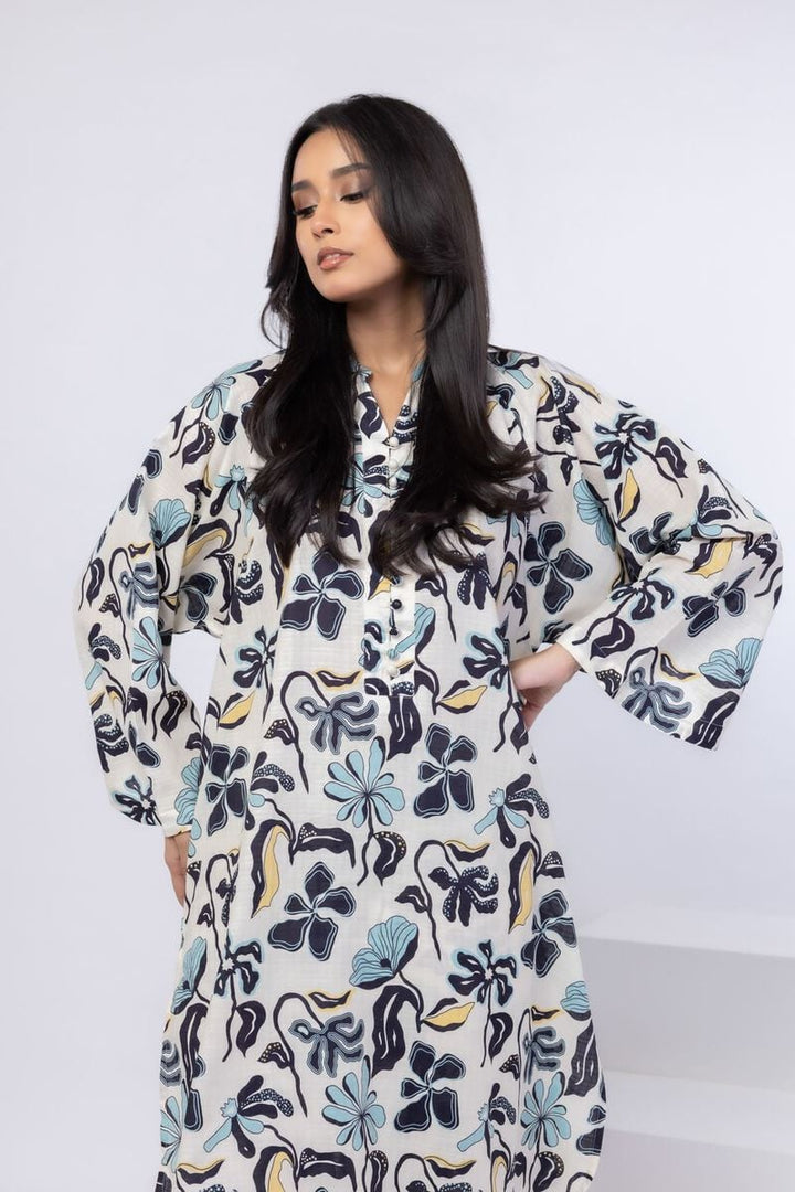 - Description: A long floral printed kurta featuring full sleeves with a band collar, and a rounded hem.