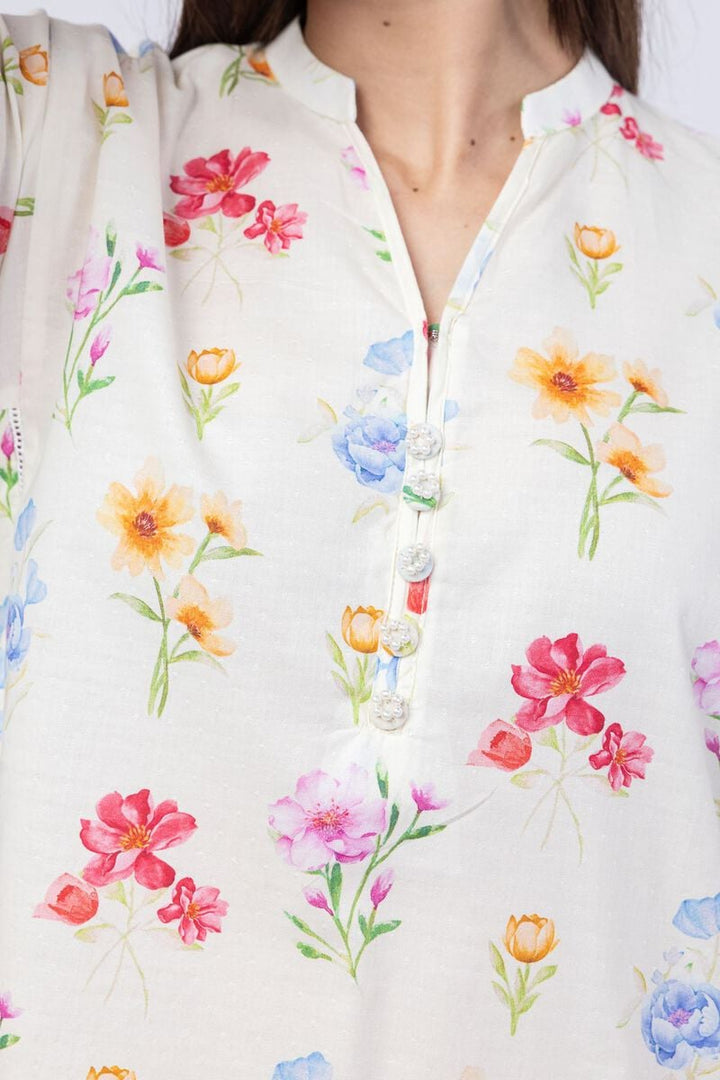 A short floral printed kurta featuring full sleeves and a band collar with a V-cut.