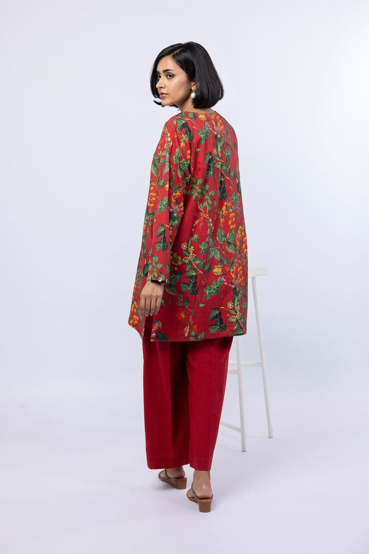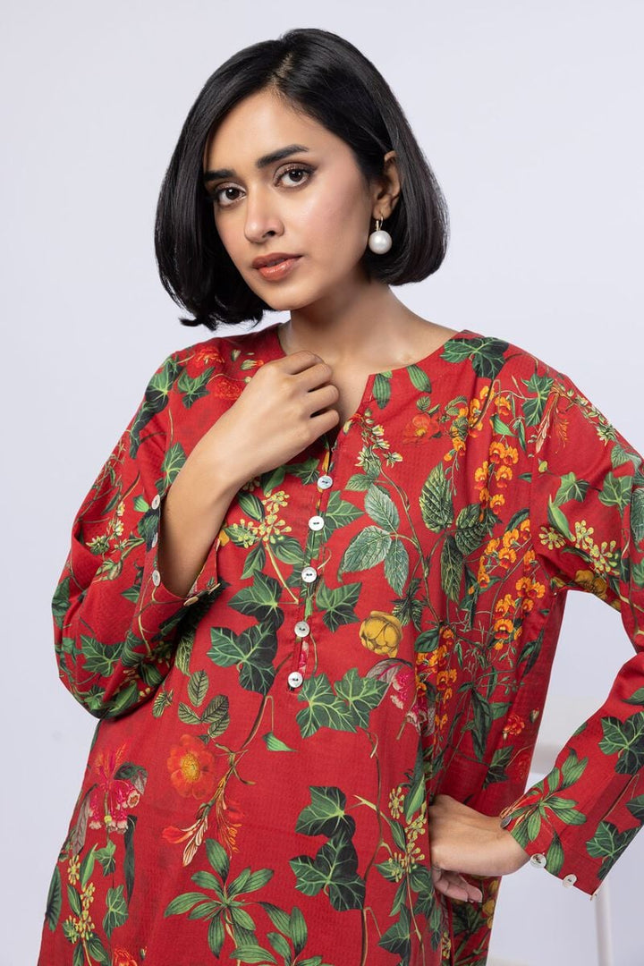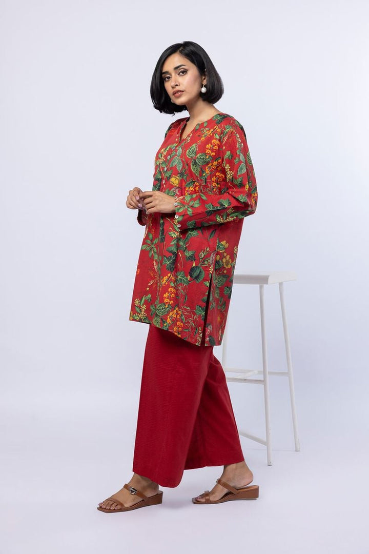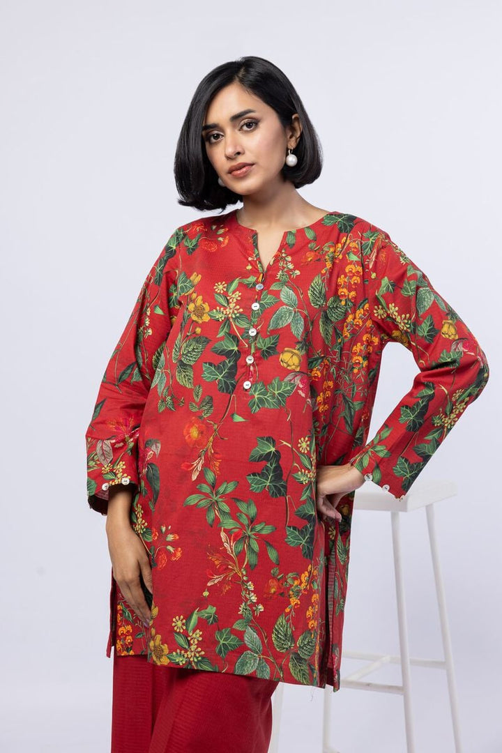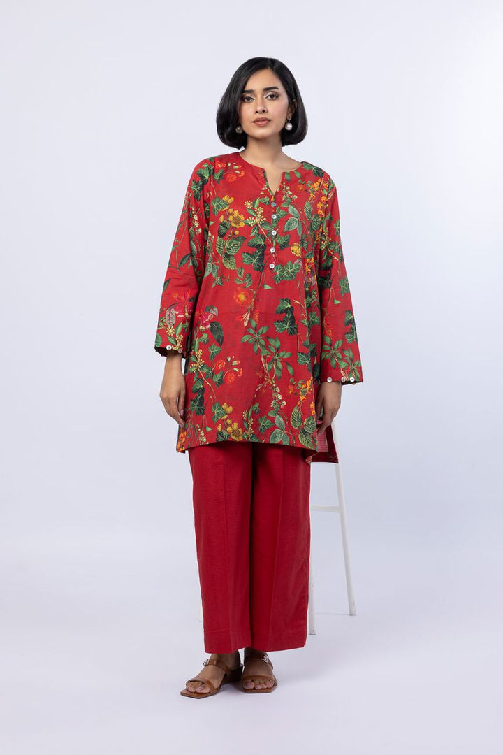 - Description: A short floral printed kurta featuring full sleeves with button detailing and a round neckline with a V-cut and buttons on the front.
