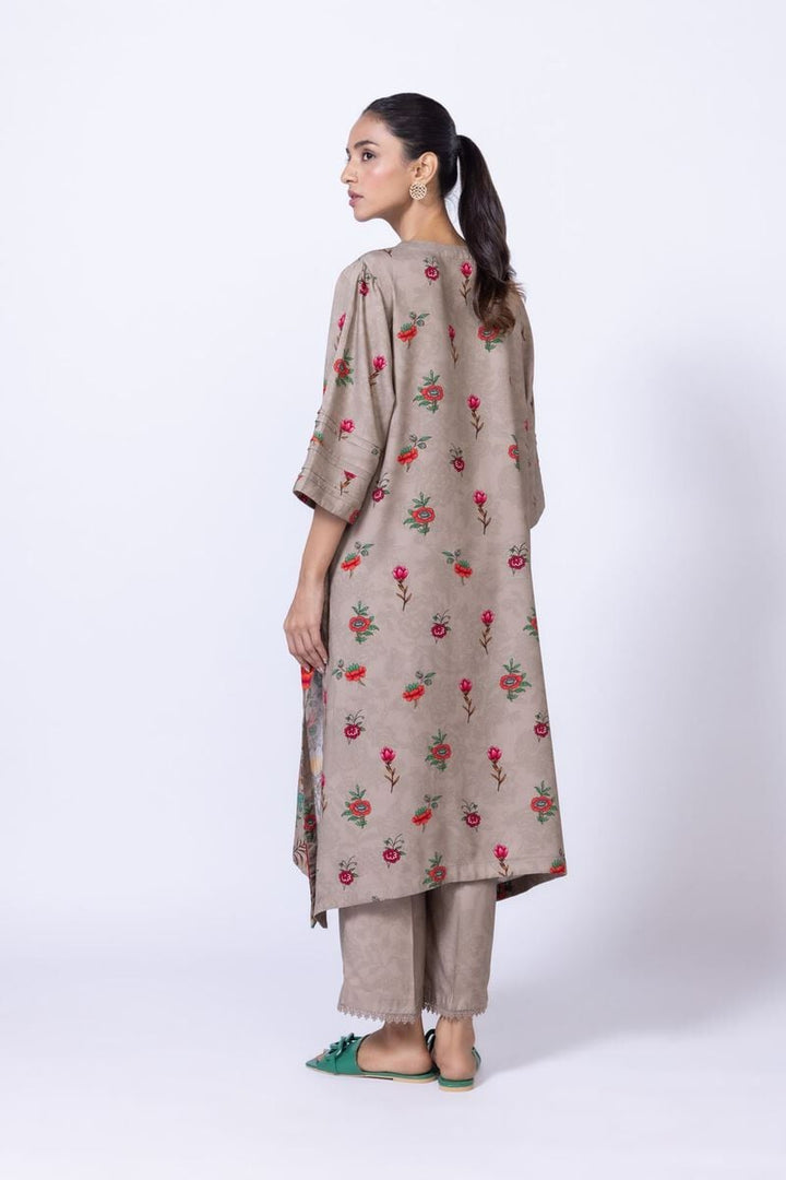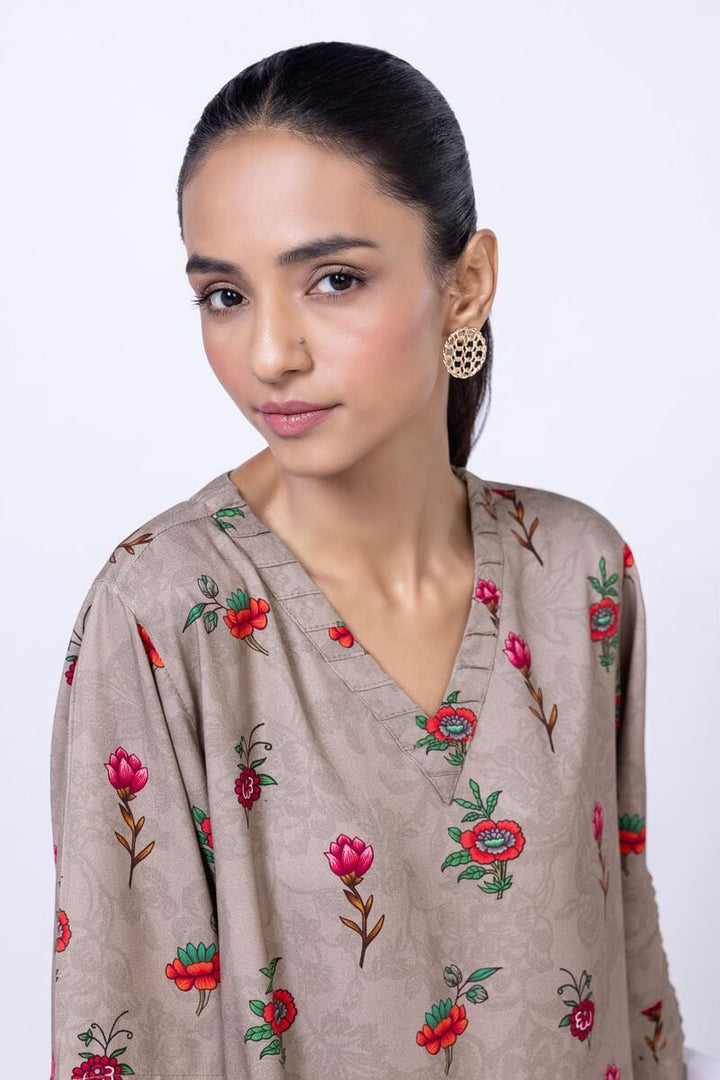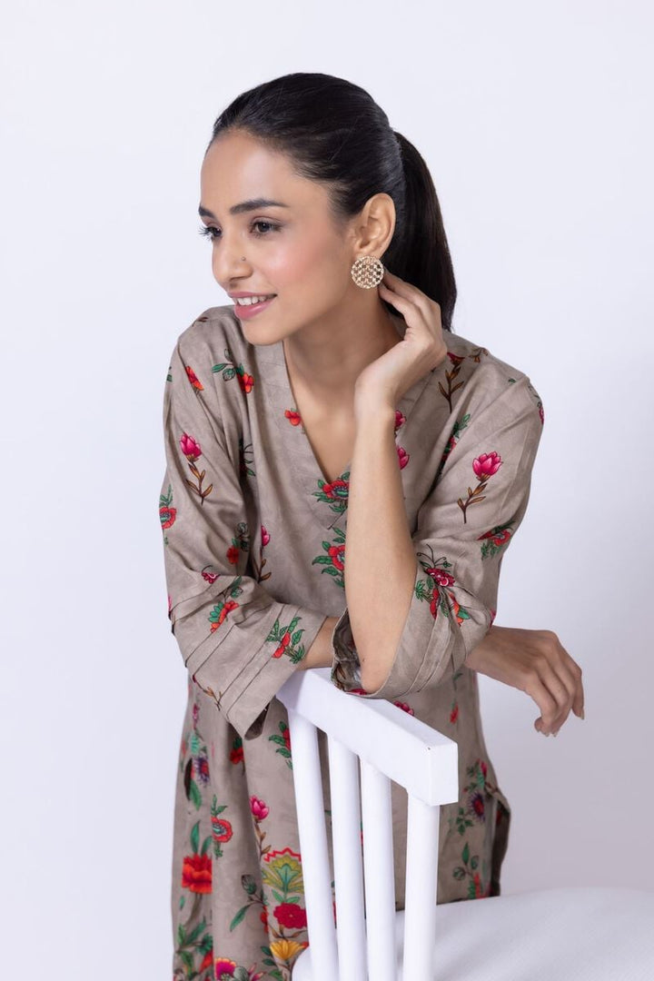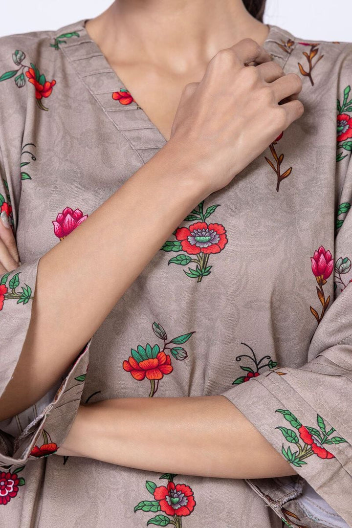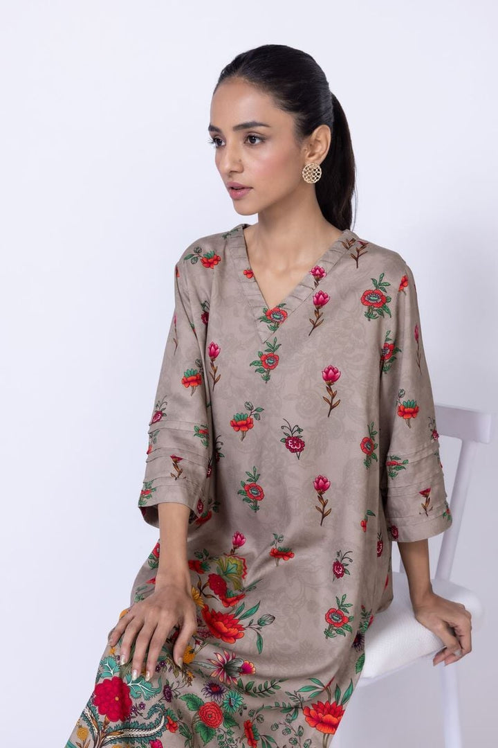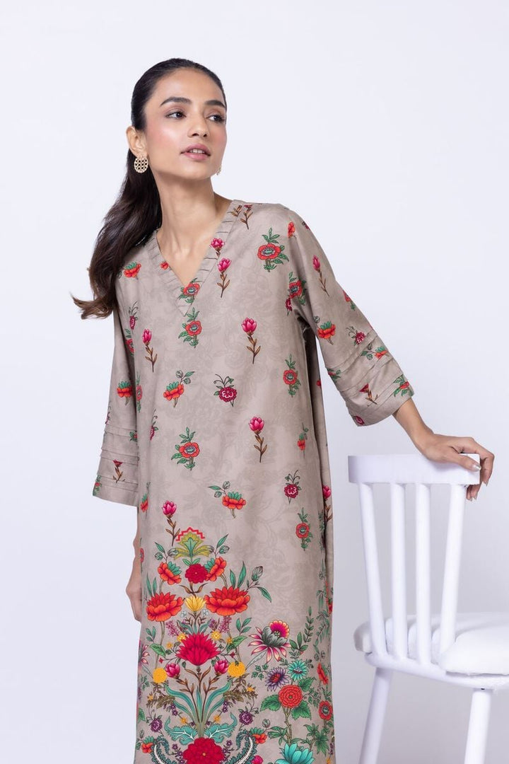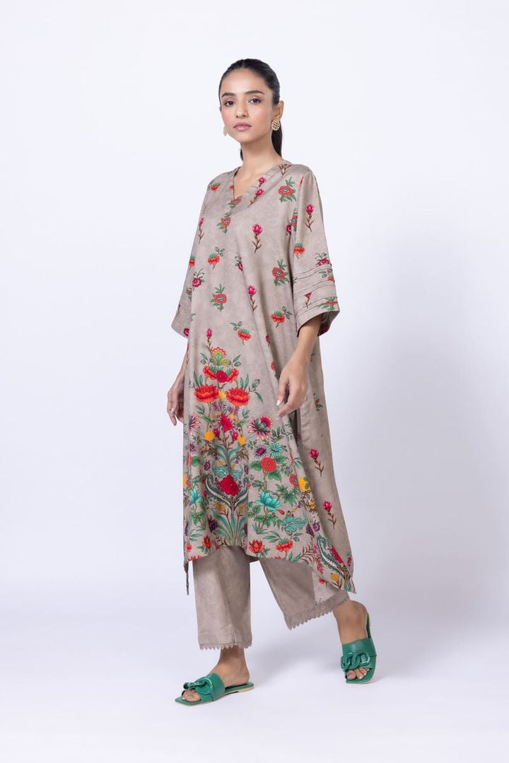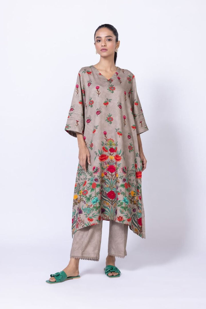 A long floral printed A-line kurta featuring three-quarter sleeves with pintuck detailing and a V-neckline.