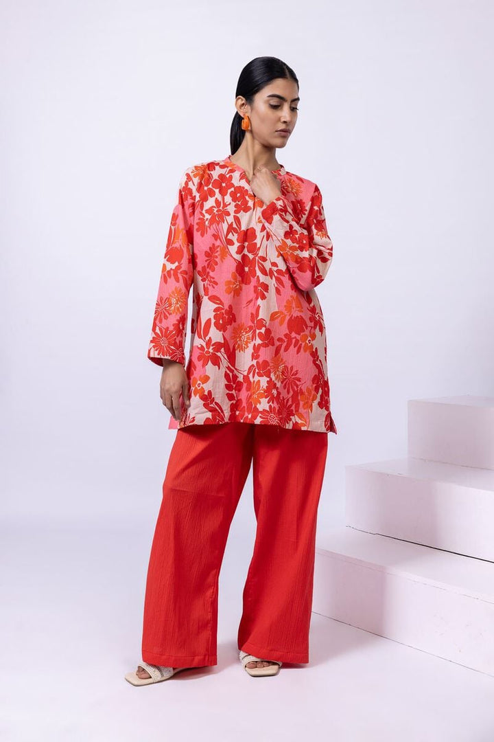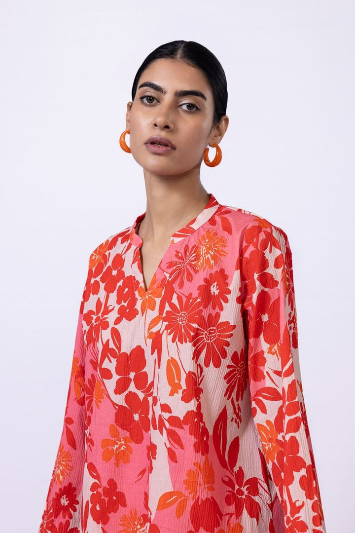 A short floral printed kurta featuring full sleeves and a band collar with a V.