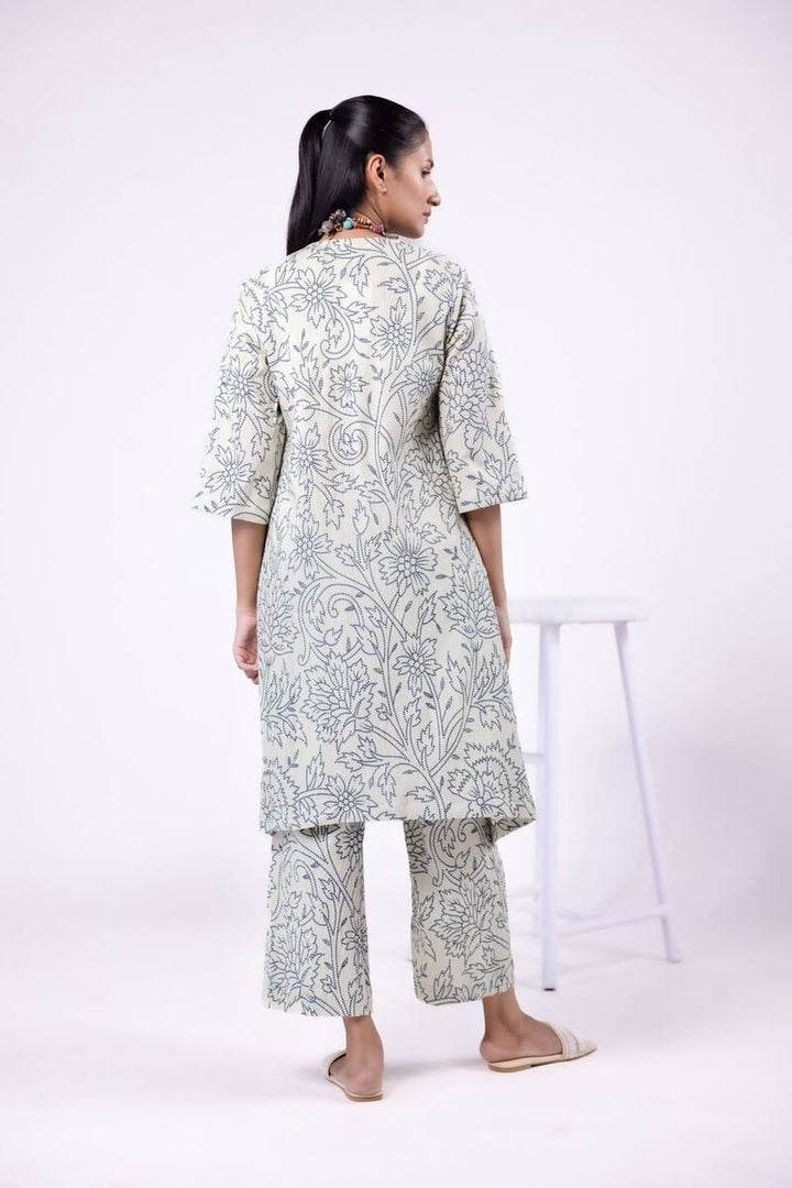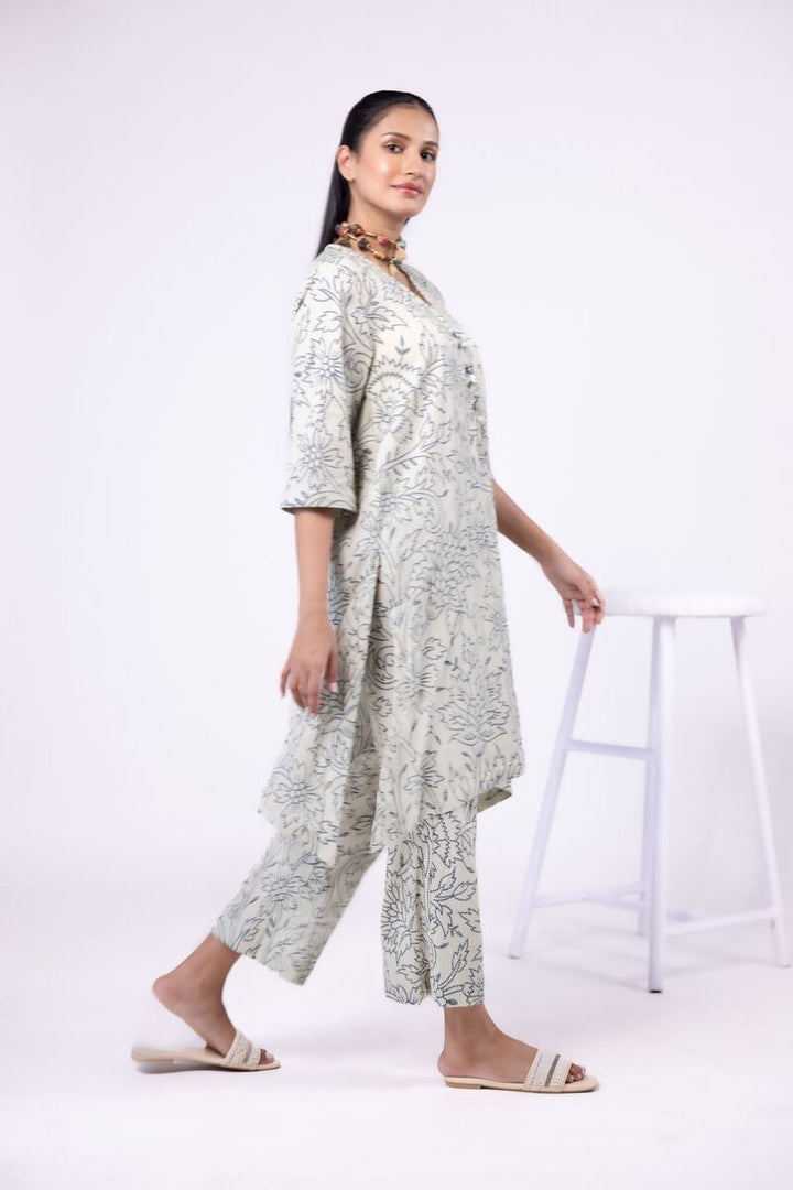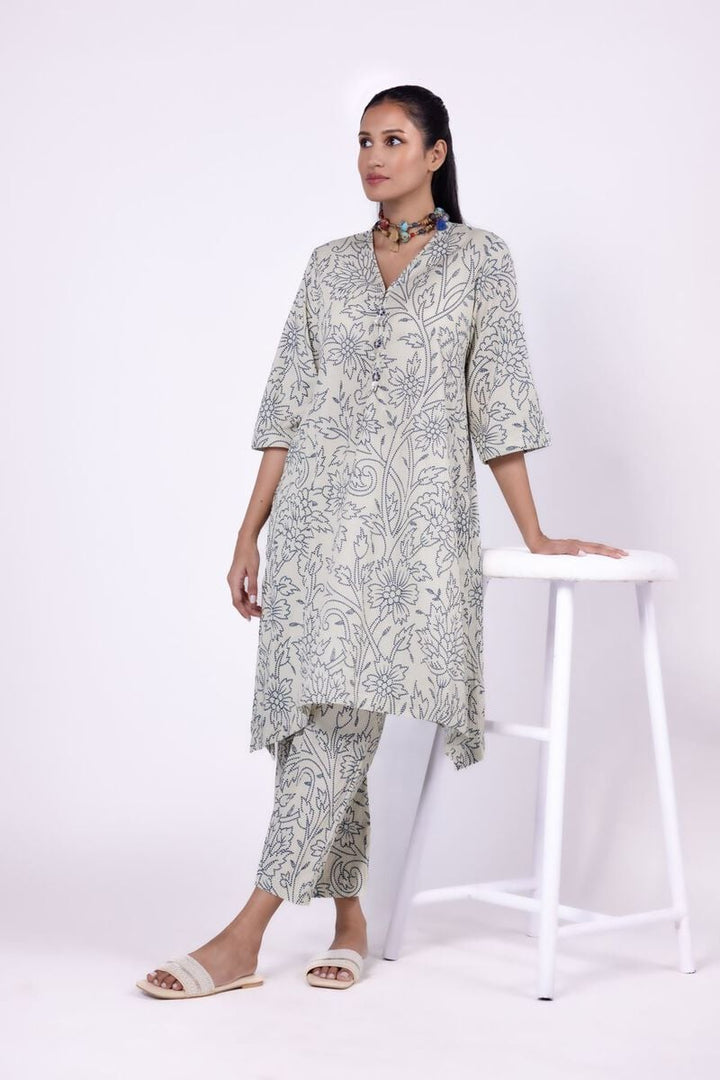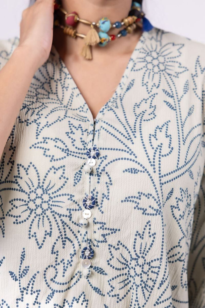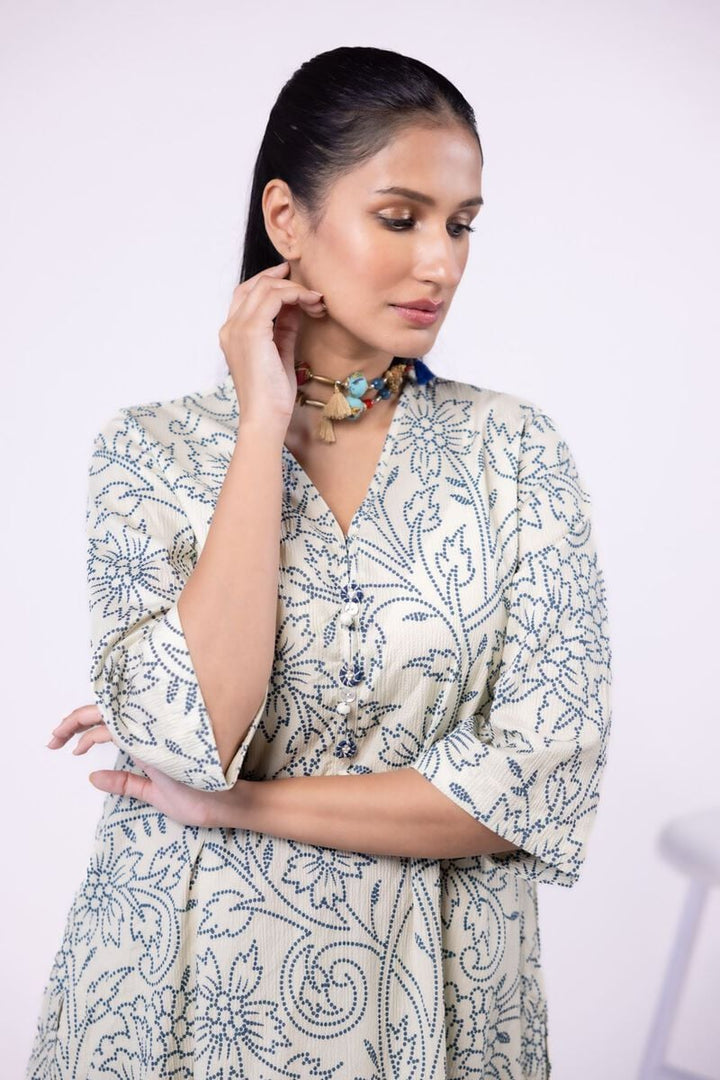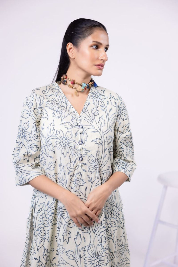 - Description: A floral printed kurta featuring short sleeves and a neckline with a V-cut.
