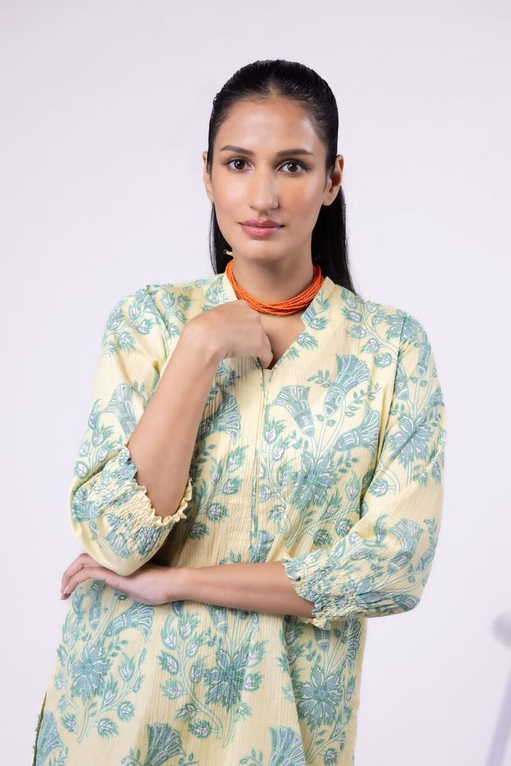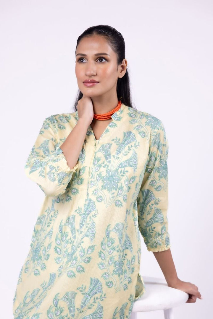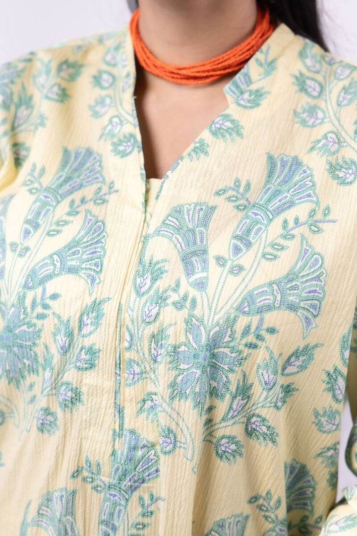 - Description: A short floral printed kurta featuring full sleeves and a band collar with a V-cut.