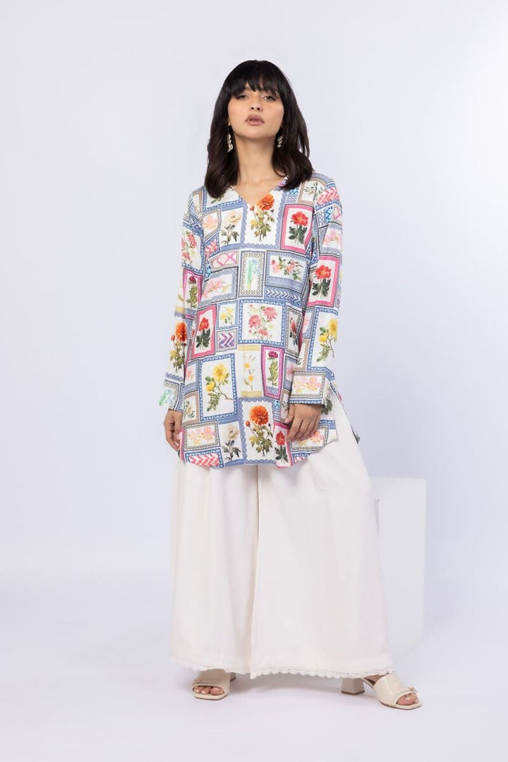 - Description: A short floral printed kurta featuring full sleeves and a neckline with a V-cut.