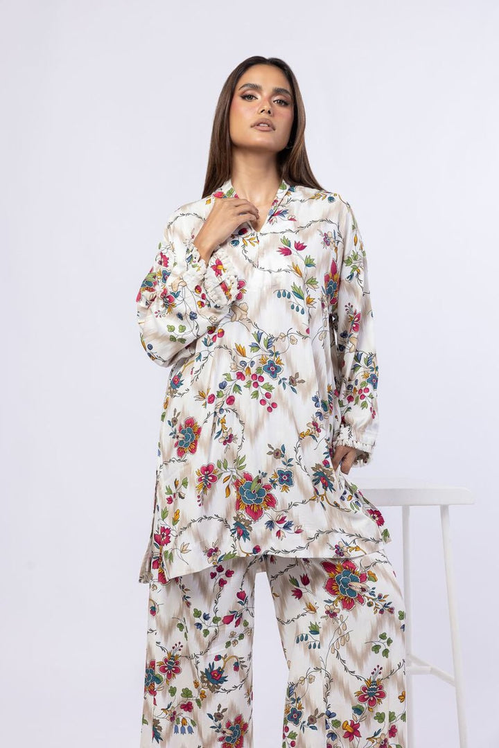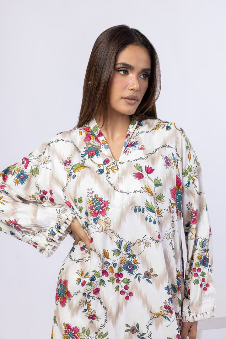 A floral printed kurta featuring full sleeves with finishings and a neckline with a V-cut.