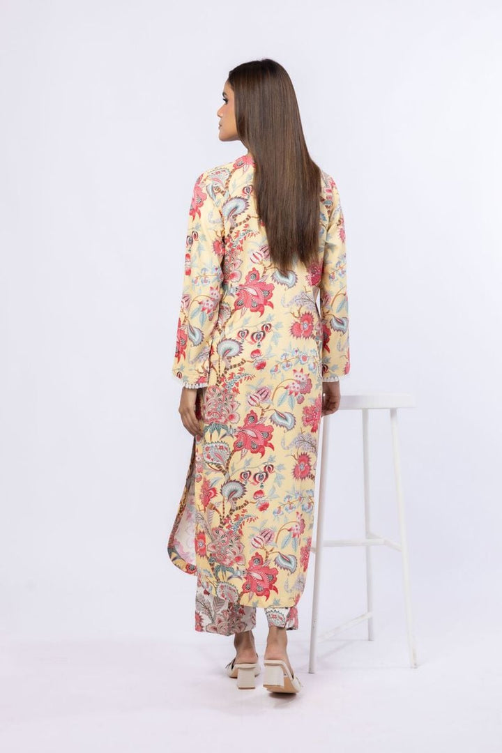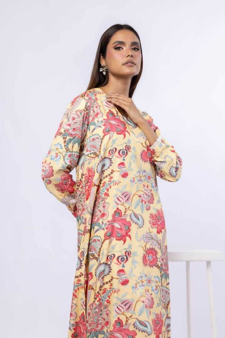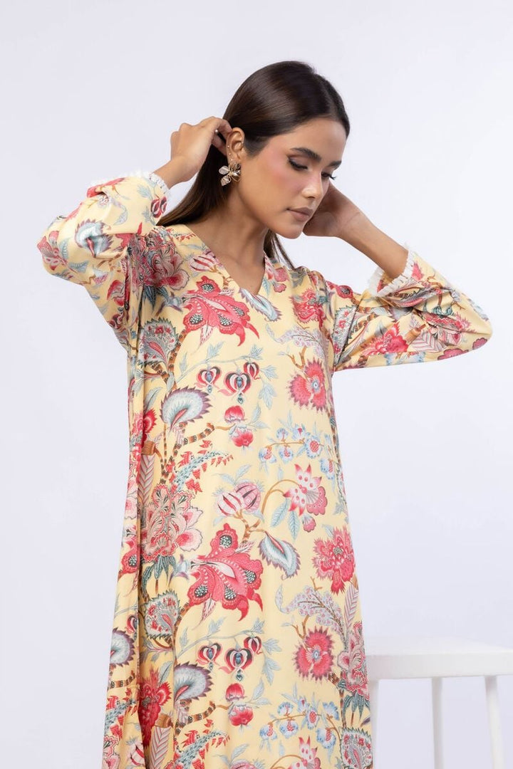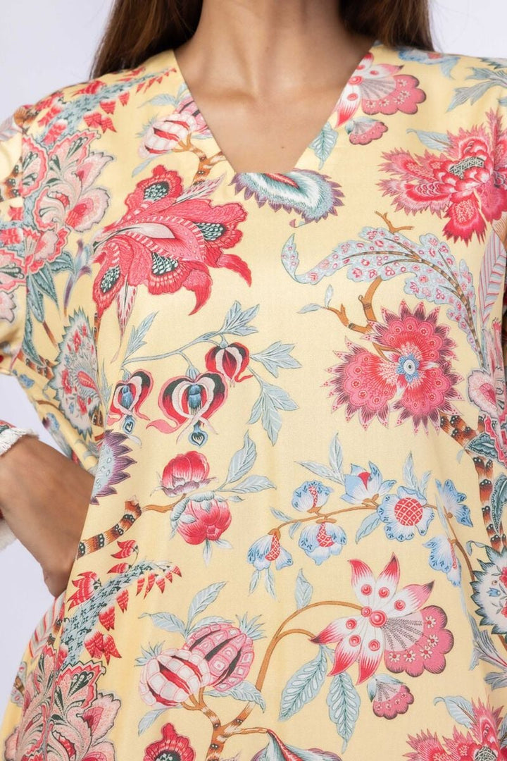 Description:A short floral printed kurta featuring full sleeves with lace detailing and silver coins, a round neckline with a V-cut and hoop finishings on the front.