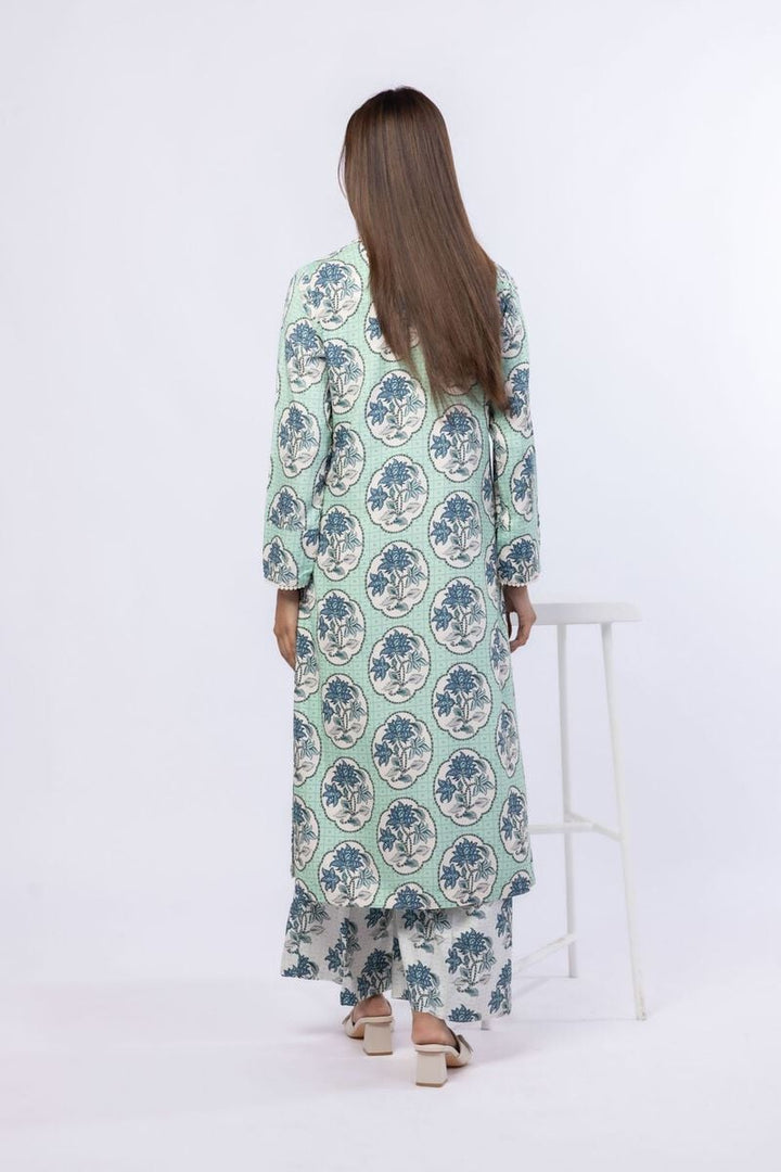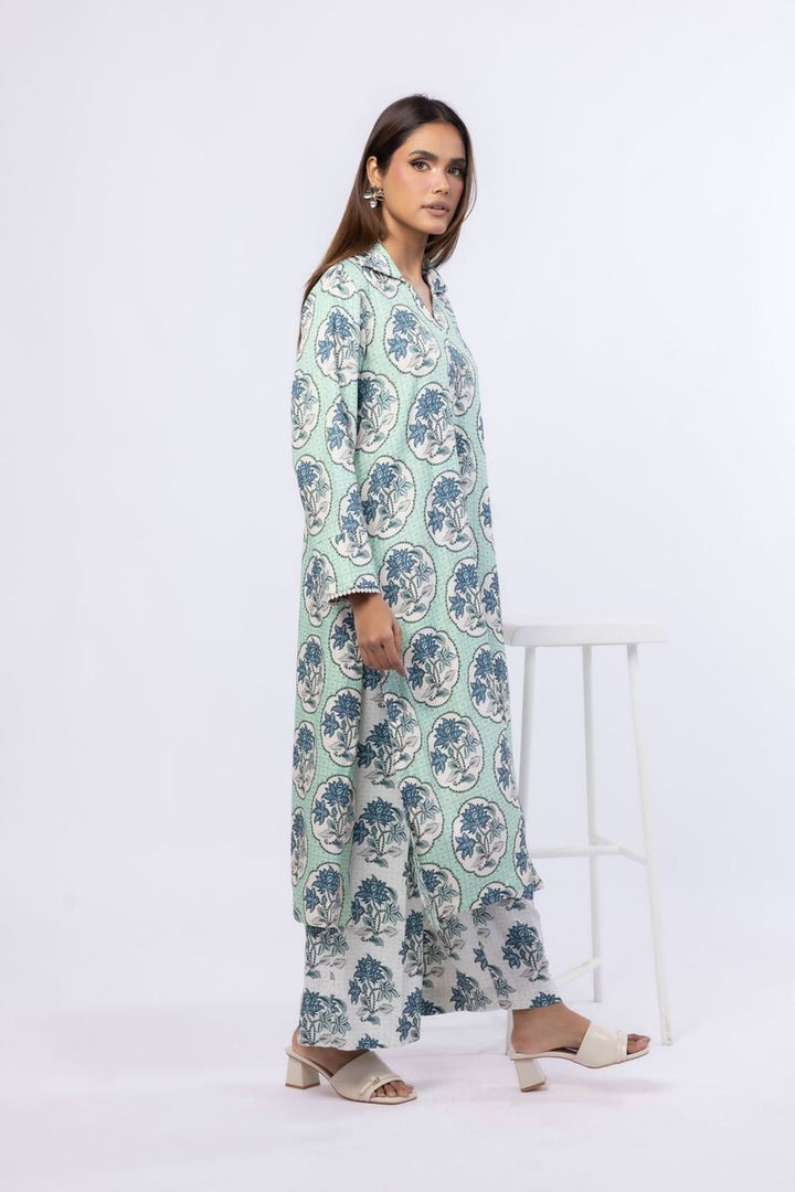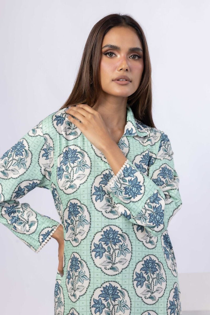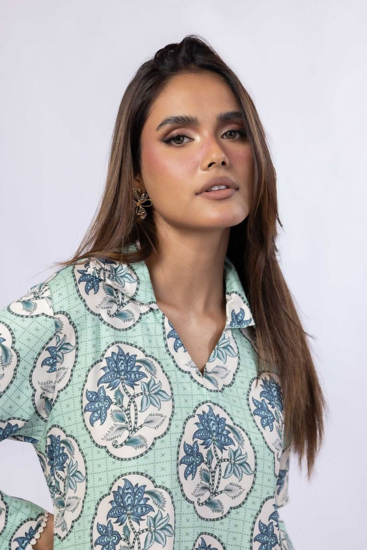 A long floral printed kurta featuring lace on the full sleeves and the wing collar neckline.