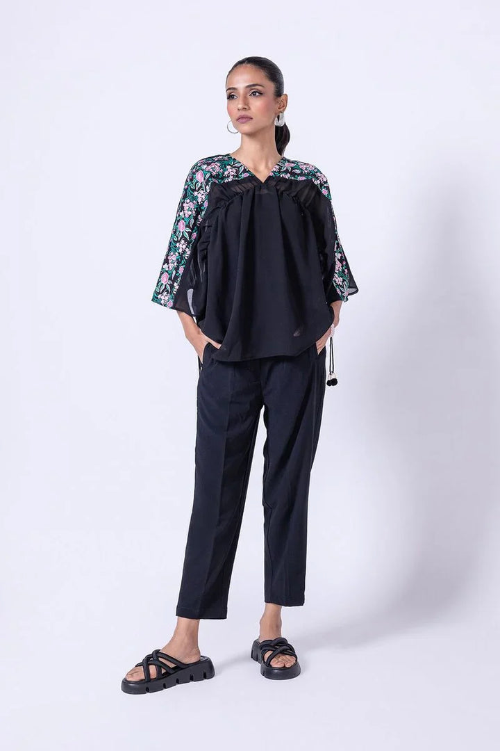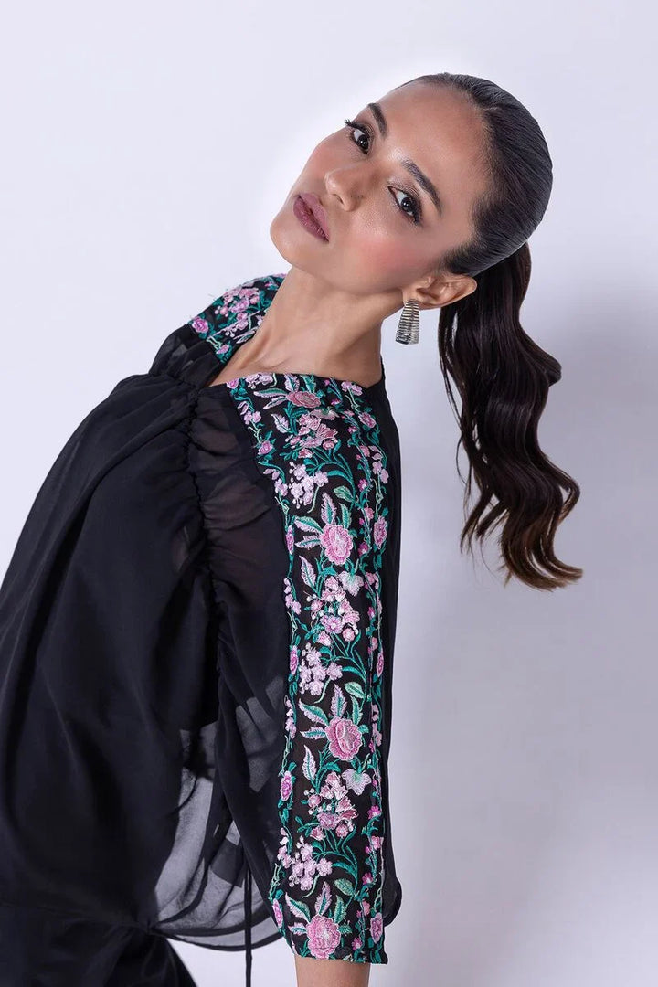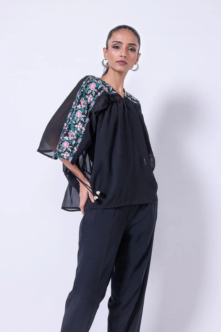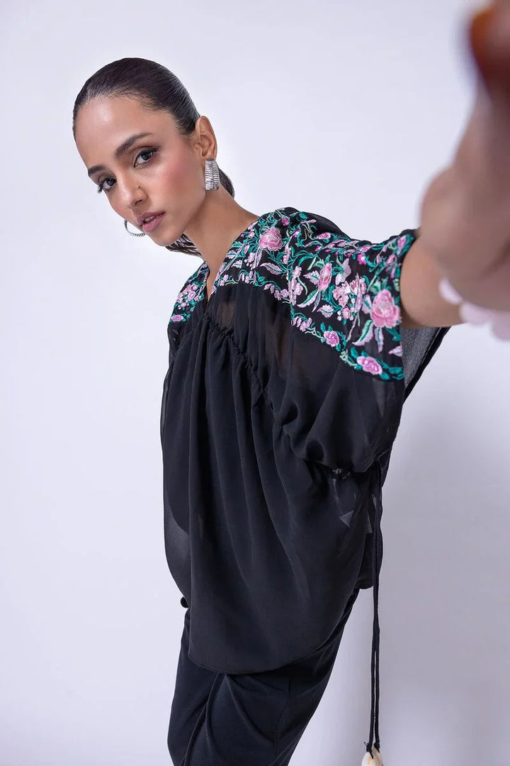 - Description: A short georgette chiffon kaftan shirt featuring floral embroidery.